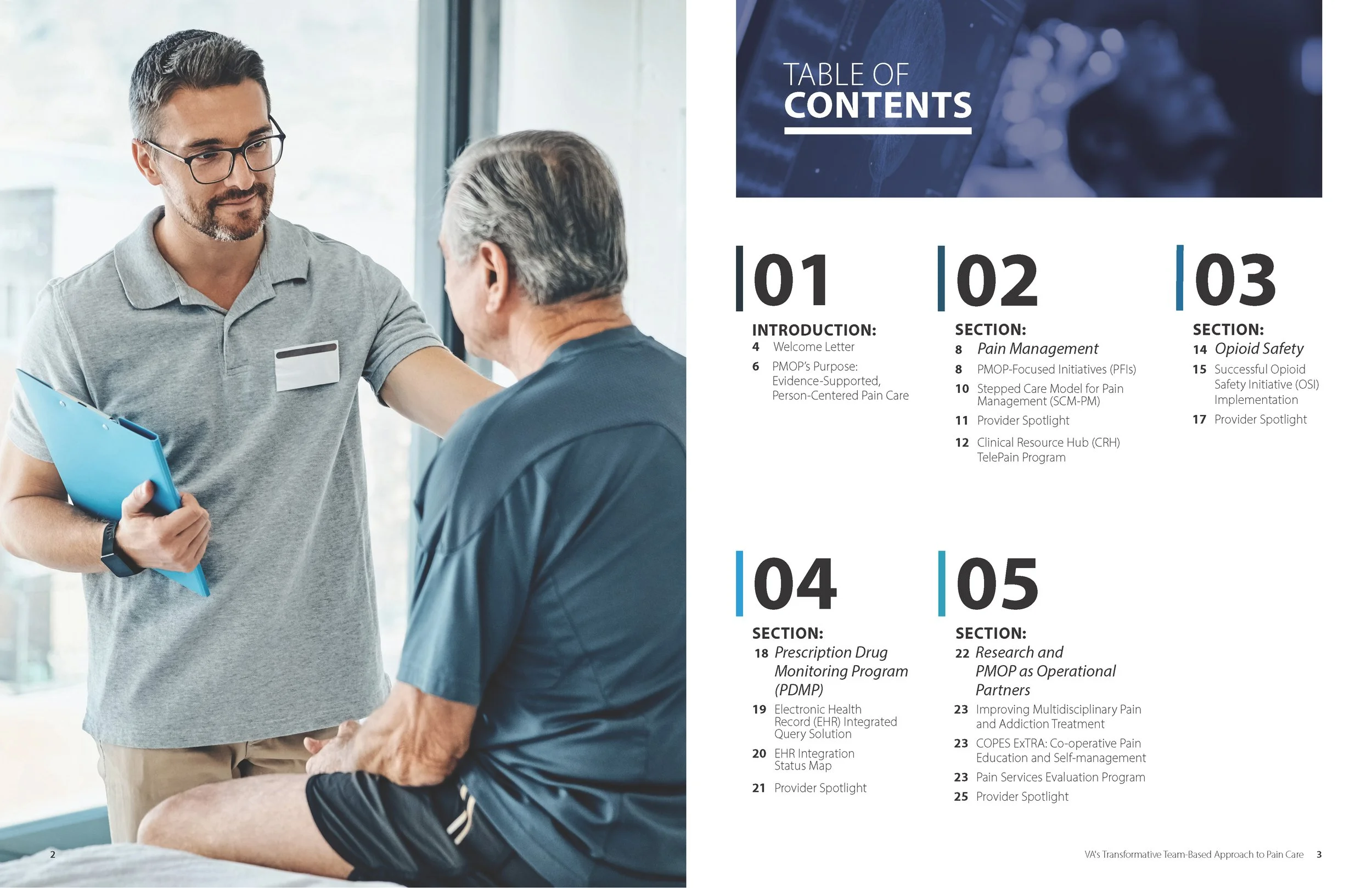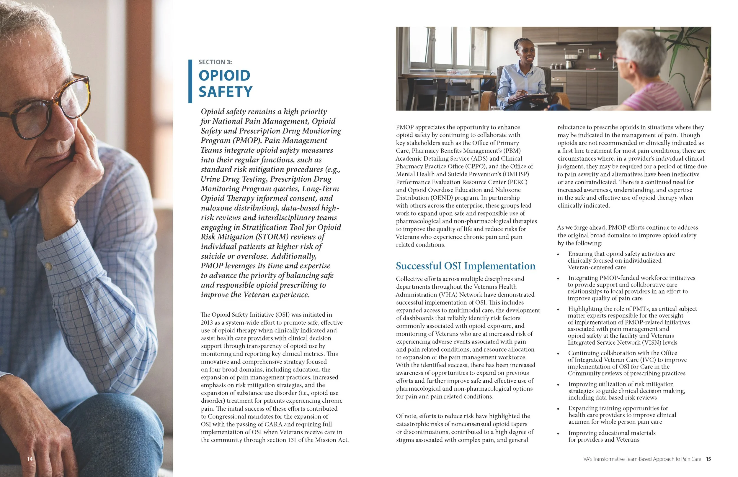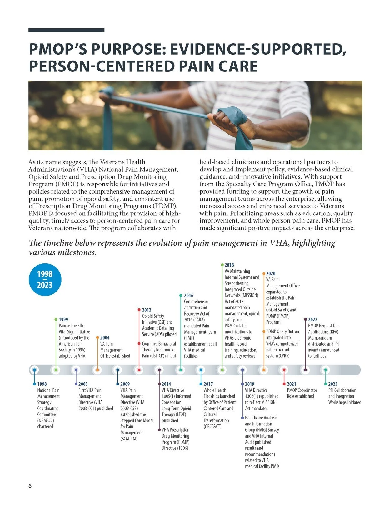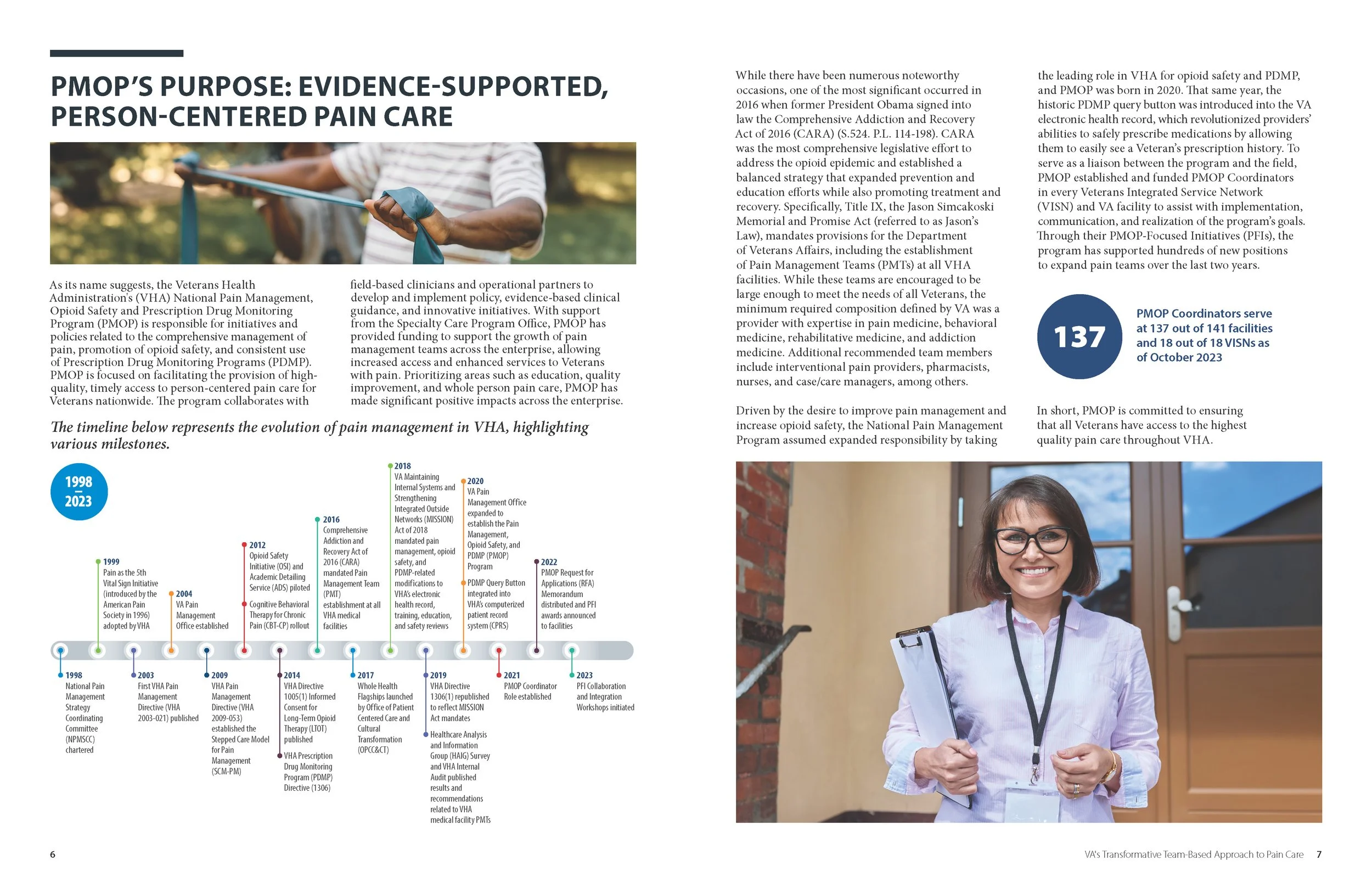 The U.S. Department of Veterans Affairs (VA) is dedicated to enhancing pain care for Veterans through a patient-centered approach informed by the Pain Management, Opioid Safety, and Prescription Drug Monitoring Program (PMOP). Recognizing that Veterans often experience more intense pain, PMOP adopts a holistic biopsychosocial model and emphasizes the use of interdisciplinary Pain Management Teams (PMTs) across all VA facilities. This initiative includes enhancing access to care, particularly through telehealth services for rural Veterans. Furthermore, the DEAN annual report merits a platinum-level MarCom Award for its engaging and innovative presentation of the office's contributions to Veterans.