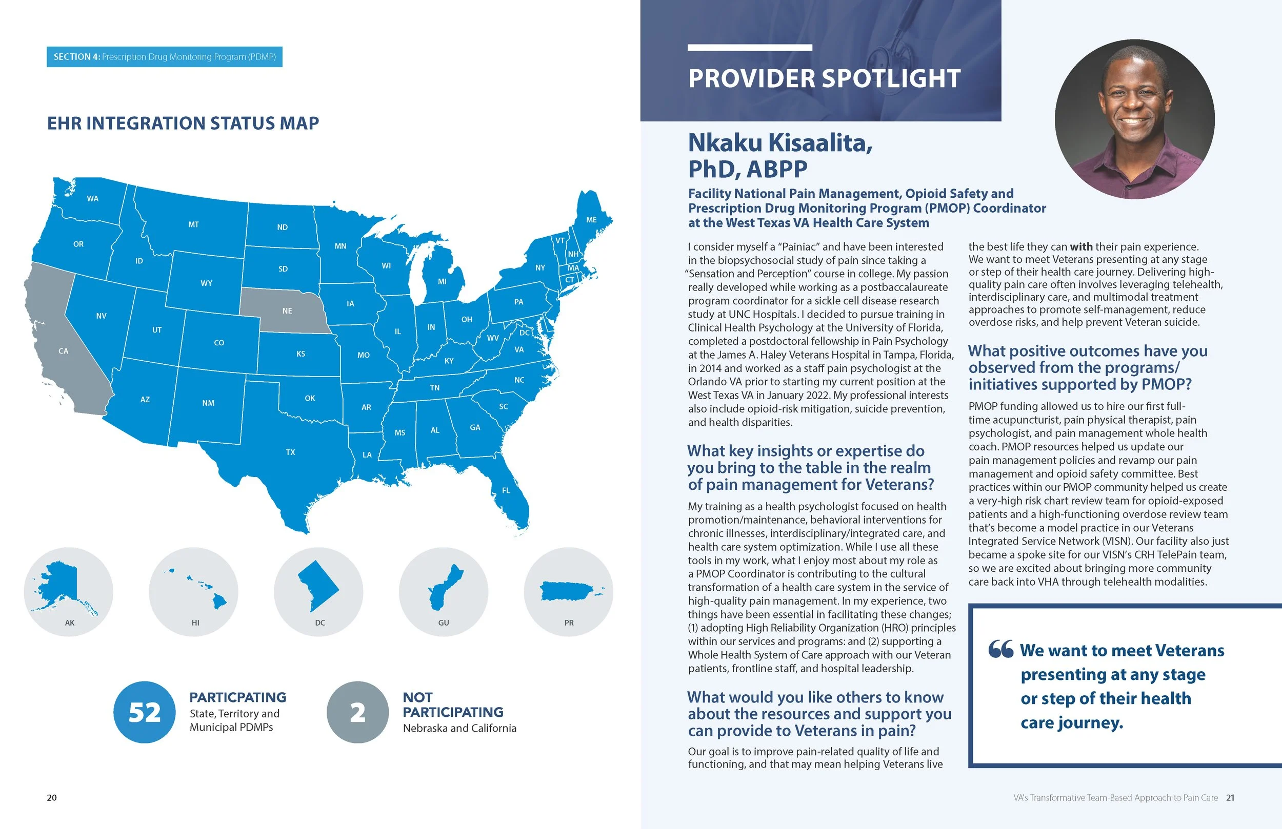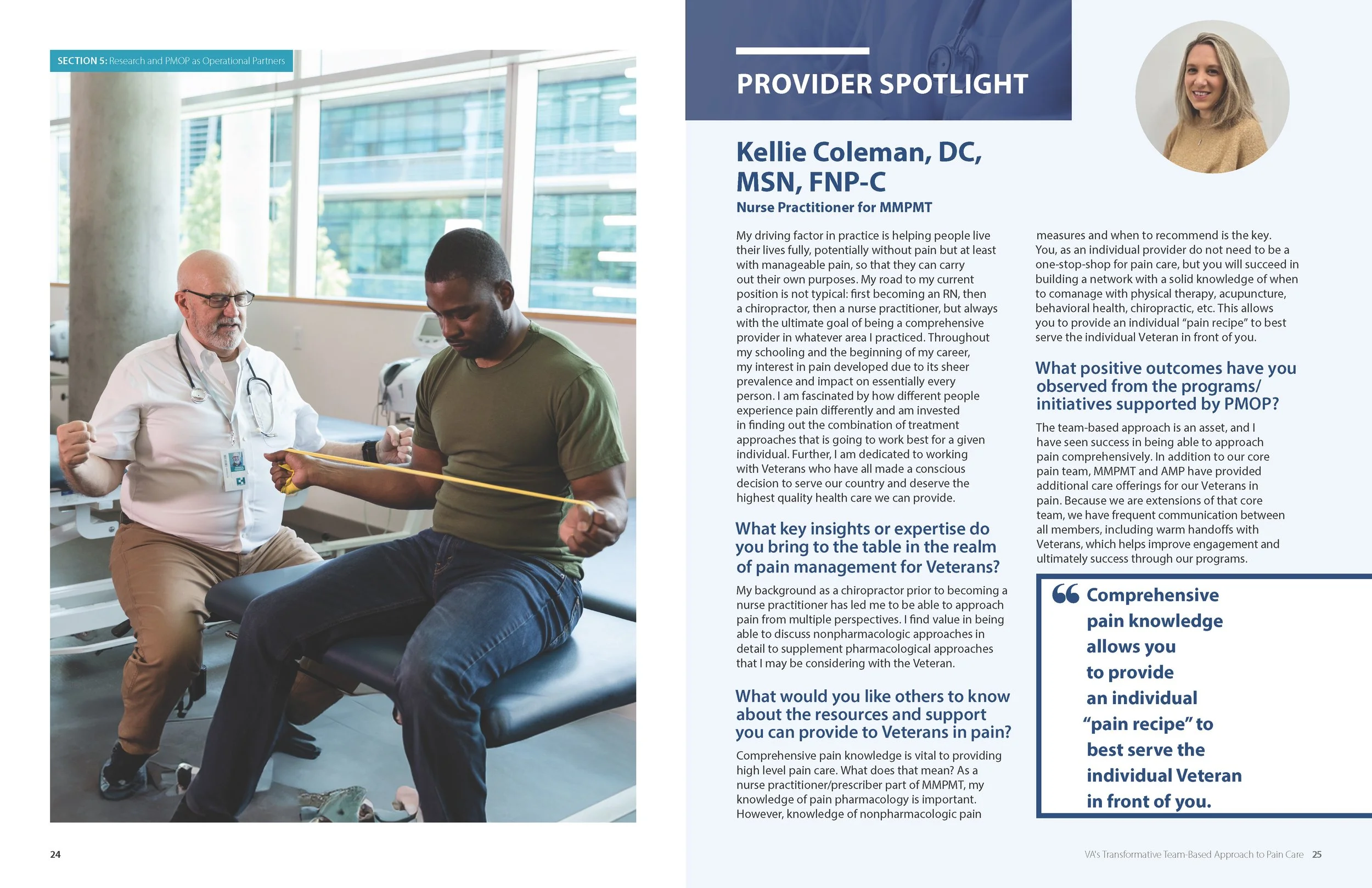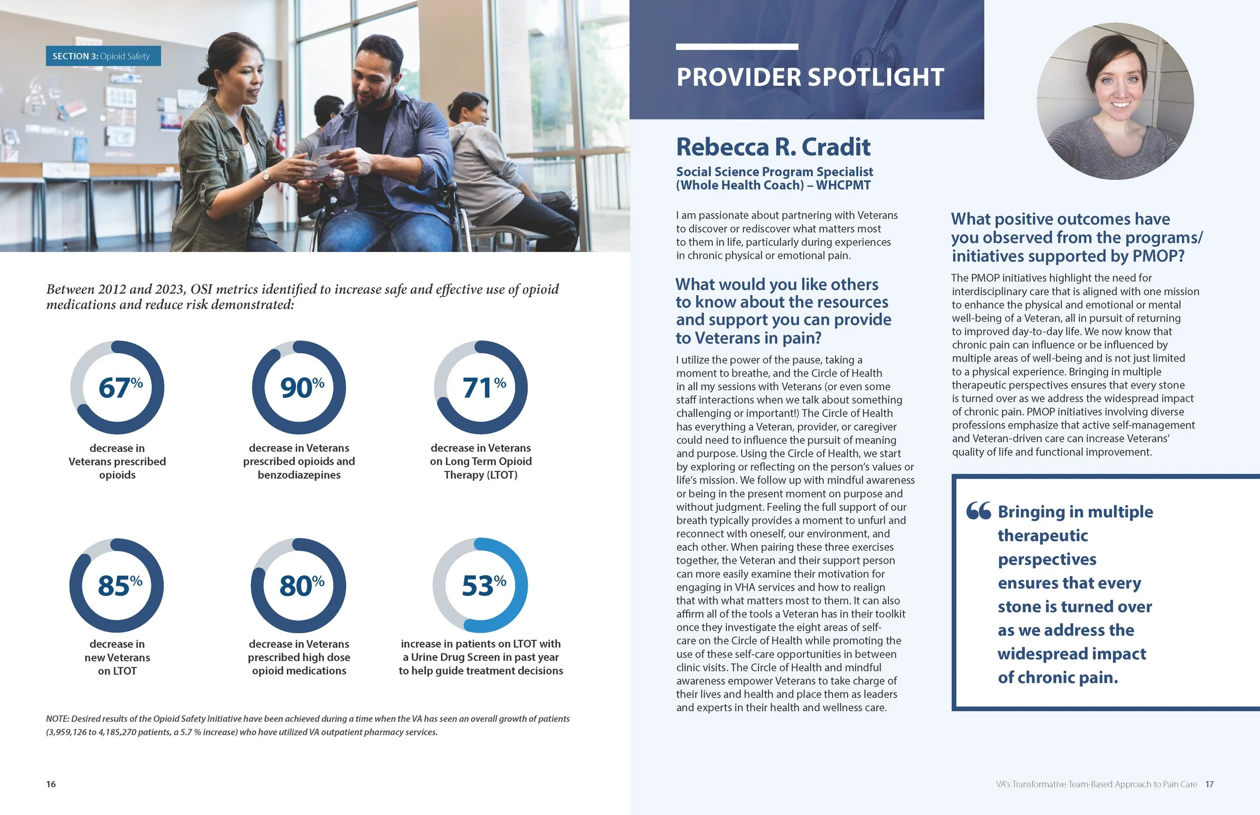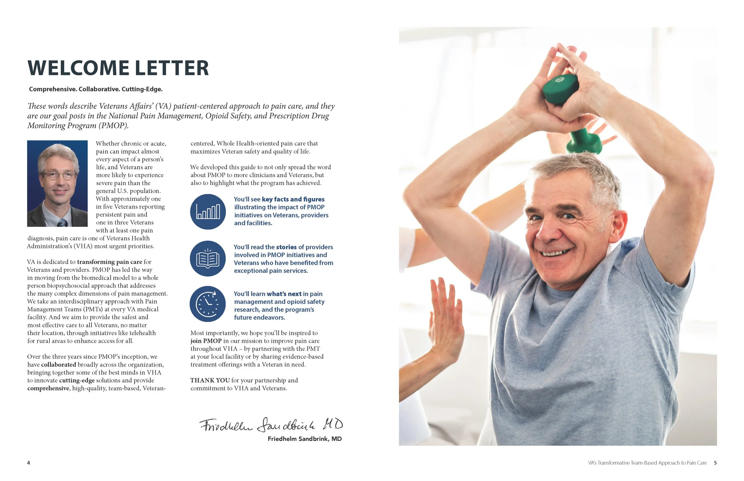 The U.S. Department of Veterans Affairs (VA) is dedicated to enhancing pain care for Veterans through a patient-centered approach informed by the Pain Management, Opioid Safety, and Prescription Drug Monitoring Program (PMOP). Recognizing that Veterans often experience more intense pain, PMOP adopts a holistic biopsychosocial model and emphasizes the use of interdisciplinary Pain Management Teams (PMTs) across all VA facilities. This initiative includes enhancing access to care, particularly through telehealth services for rural Veterans. Furthermore, the DEAN annual report merits a platinum-level MarCom Award for its engaging and innovative presentation of the office's contributions to Veterans.